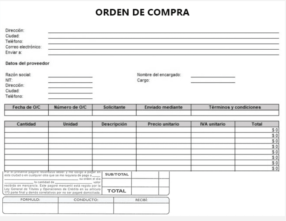 Este es un documento que emite el cliente al momento de hacer un pedido. Sirve para establecer los términos y condiciones de la compra antes de que la empresa envíe el producto. Suele contener lo siguiente: