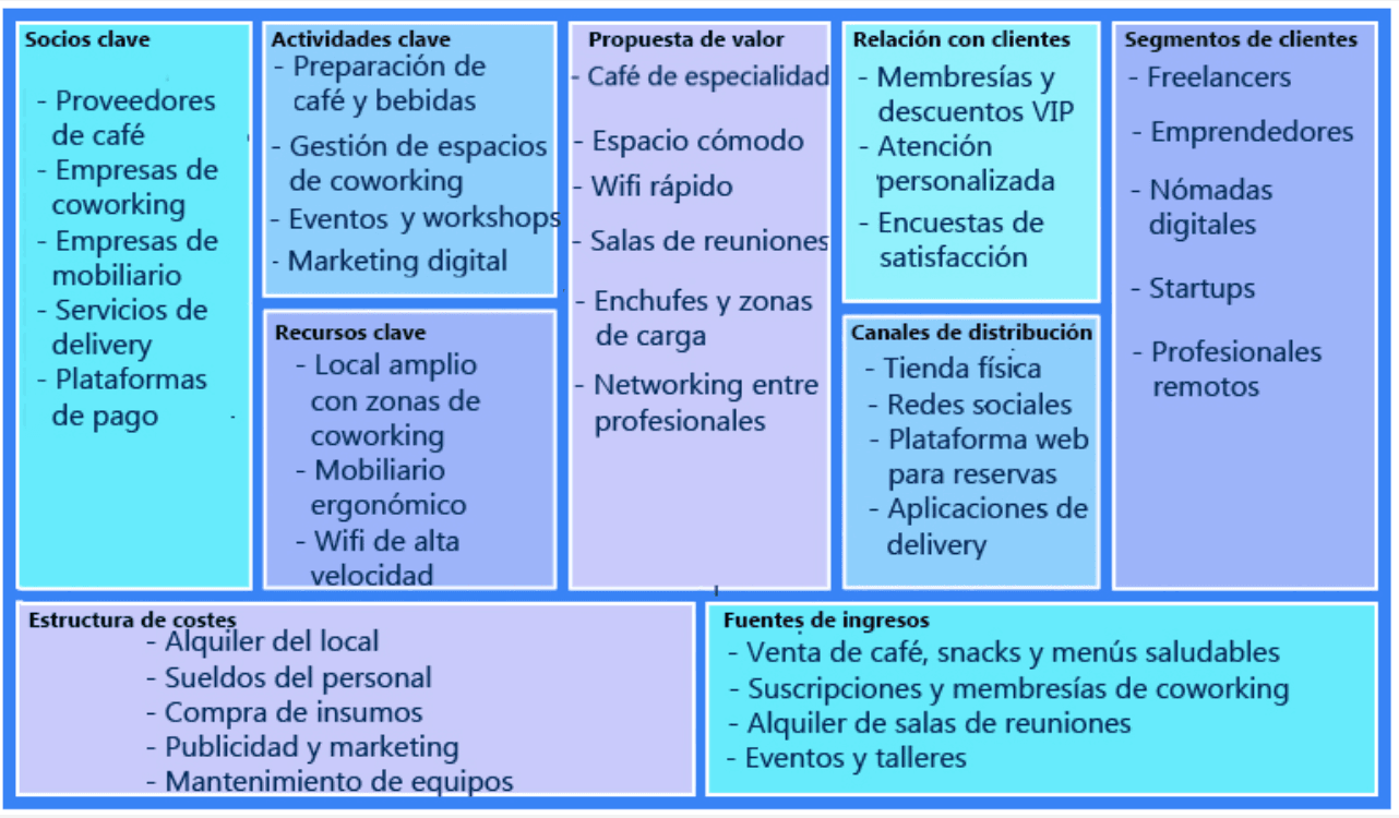 A continuación te mostramos un ejemplo de un modelo canvas aplicado a una cafetería con servicio de coworking: