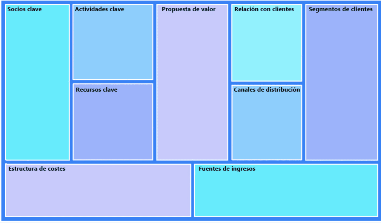 La metodología Canvas se compone de una matriz de nueve bloques con los elementos clave en el funcionamiento de un negocio. Generalmente se distribuye de la siguiente manera: